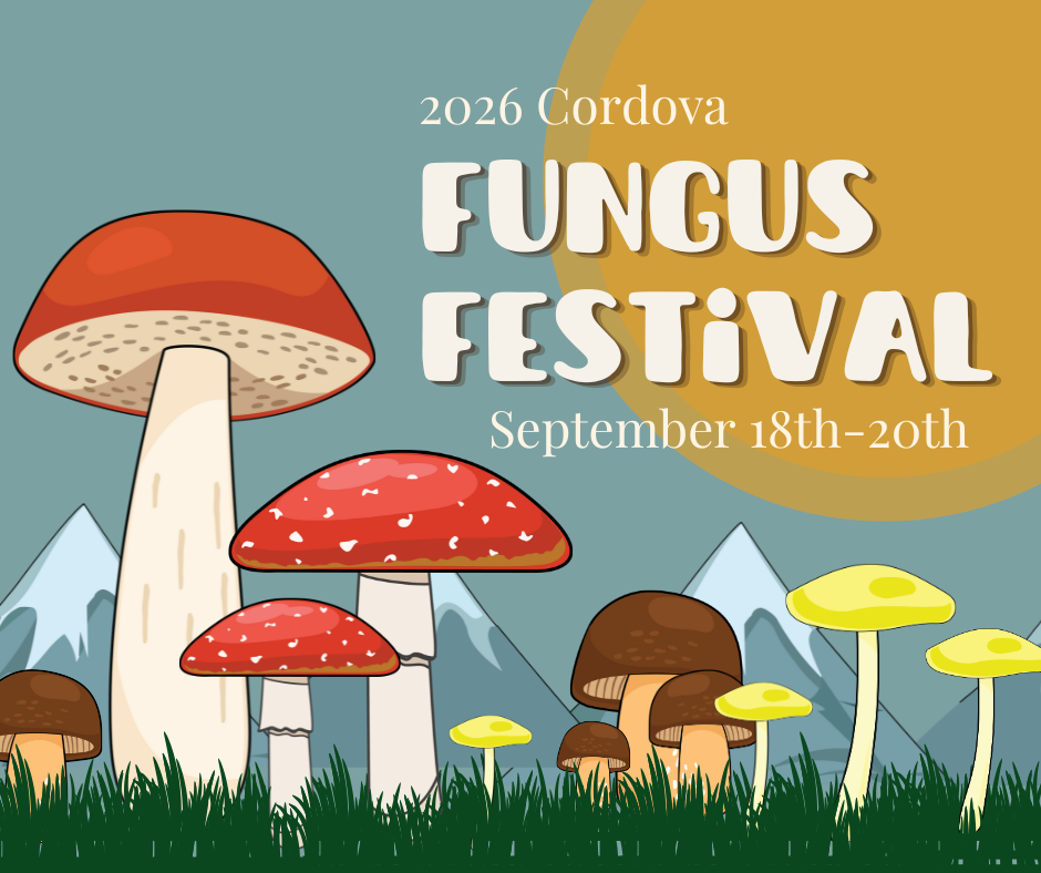 Every year the lucky salmon that make it past Cordova’s keen fishermen head upstream, spawn, and leave abundant nutrients on the creek shores that are transported by fungi to nourish the entire forest. And every fall, Cordova’s land-based foragers venture into the wilderness to hunt nature’s delicacies like wild berries, yellow-footed chanterelles, and king boletes. Cordova’s lush forests offer the perfect environment for these natural treasures to thrive and the perfect setting for anyone interested in nature’s wonders to learn about the interconnectedness of fungus, the forest, & the sea. Come celebrate with fungus-pluckers and lichen-lovers from near and far at the Cordova Fungus Festival! Our 19th annual festival will take place in Cordova from September 18-20, 2026. Festival headquarters will be located at the Cordova Center in downtown Cordova.